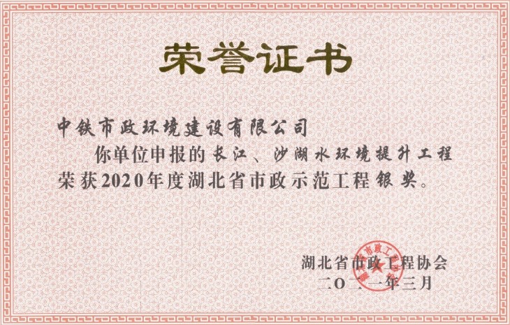 近日,2020年湖北省市政示范工程評選結果公布,公司長江、沙湖水環境提升工程項目喜獲湖北省市政示范工程銀獎。